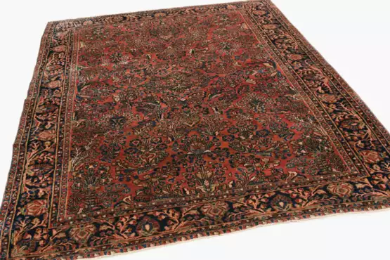 Z-Persien, um 1930. Sog. "Amerikanischer Saruk". In der Mitte des stilvollen rosaroten Mittelfeldes liegt ein filigranes Rautenmedaillon, flankiert von dicht platzierten Floralmotiven, Ranken und Blütenbouquets in unendlichem Rapport. 4 Rosettenborten säumen die nachtblaue, mit Palmetten und Blütenzwickeln reich verzierte Hauptbordüre auf dekorative Weise. Gute Erhaltung. 187x259 cm (ft. 6.2x8.5).