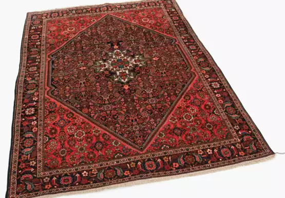 Z-Persien, um 1920. Feine Knüpfung. Im tiefblauen hexagonalen Mittelfeld thront ein weisses Kreuz-Medaillon mit einer aparten Sternblüte im Zentrum, flankiert von einem dekorativen Herati-Streudekor, das sich über das gesamte Feld erstreckt und in den 4 roten Eckzwickeln weitergeführt wird. 2 weisse Rosettenborten säumen die filigran gezeichnete Palmetten- und Ranken-Bordüre auf dekorative Weise. Gute Erhaltung. 133x201 cm (ft. 4.4x6.6).
