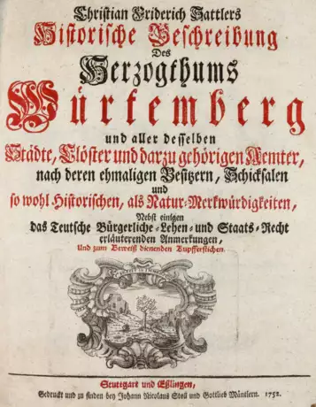 Erste Ausgabe. - Vgl. ADB XXX, 409 f.: "...den fleißigen Darsteller der württembergischen Geschichte". Enthält Beschreibungen von Stuttgart, Schorndorf, Nürtingen, Tübingen, Göppingen, Pfullingen etc. - Die Kupfer mit Wappen u. Siegel, sowie Ansichten von der Stammburg Wirtemberg bei Untertürkheim, Schloß Teck bei Kirchheim etc. - Es fehlt Tafel 5 (mit der Ansicht v. Kloster Marbach). Tls. etw. gebräunt u. fleckig.