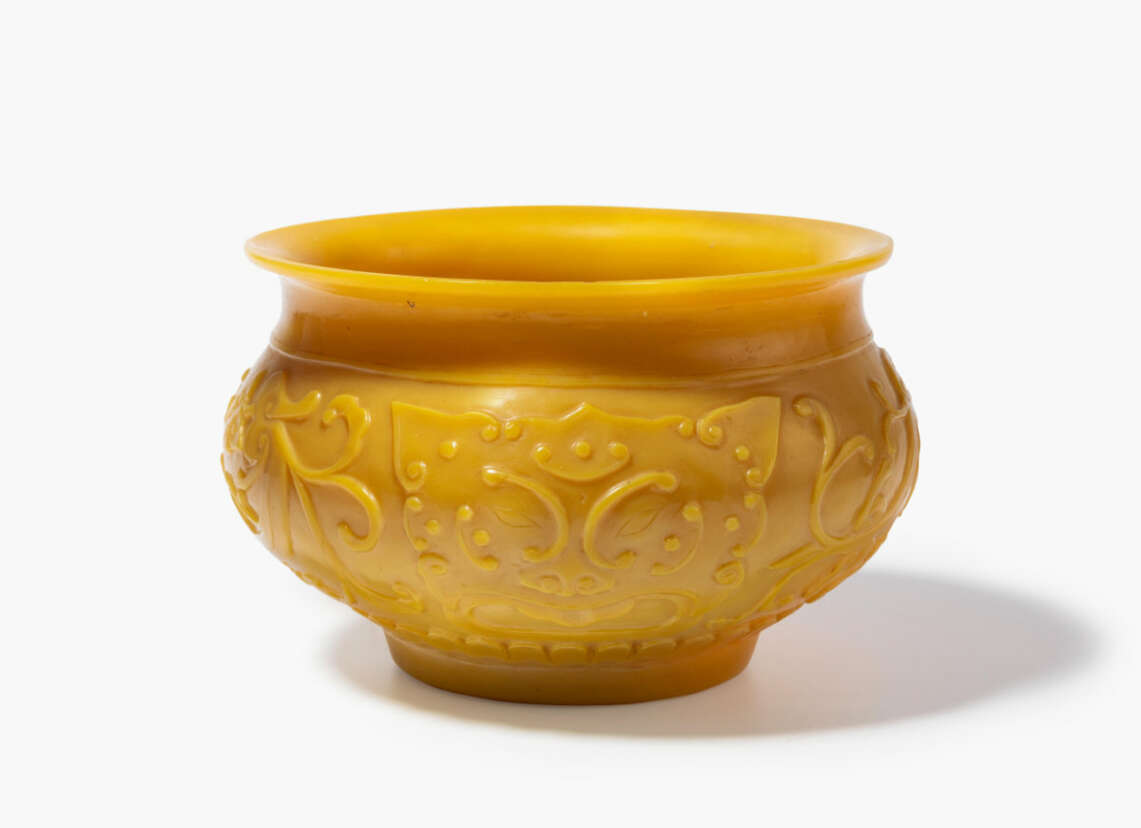 China, 19./20.Jh. Opak gelbes Pekingglas. Boden mit Qianlong-Marke. Umlaufender, stilisierter Dekor mit Chilong und Taotie-Masken. D 13 cm.