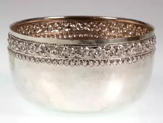 Лот 731 | Schale, rund, Silber (geprüft), Thailand, Handarbeit, leichter Hammerschlagdekor und Reliefkante, Gew. 220 g, H. 9 cm, Dm. 16 cm