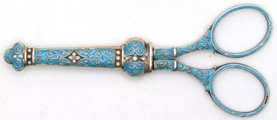 Лот 741 | Schere mit Scheide, 925er Silber, Marius Hammer Norwegen, z.T. türkisfarben emailliert (1 kl. Fehlstelle), mit eingelegten Saatperlen, L. 9,7 (11,2) cm