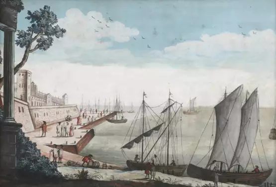 Die beiden dekorativen querformatigen Blätter erzählen vom regen Treiben der Hafenstädte im 18. Jahrhundert. Frachten werden in Fässern von Bord oder an Bord geladen und zahlreiche Männer und auch Frauen wohnen dem Treiben bei. Die befestigten Ufer laufen jeweils zu einer Seite in eine hohe Mauer aus. - Insgesamt sind die Blätter in einer ruhigen, von Blau - und Grautönen dominierten Farbigkeit gehalten, mit kräftigem Rot als Lokalfarbe in der Kleidung der Personen. Möglicherweise weist die Farbigkeit Blau, Weiß und Rot nach Holland oder Frankreich. - Ein Bl. mit größeren, aber dezenten Retuschen rechts an Knitterfläche, das andere mit kleinen dezenten Retuschen an einem Kratzer, jeweils leicht angestaubt und minimal fleckig.