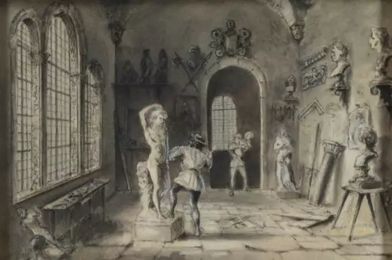 (um 1900). Maler und Bildhauer im Atelier. 2 Kreidez. weiss gehöht. 8°. Tls. sign. Beide unter Glas gerahmt (nicht ausger.)