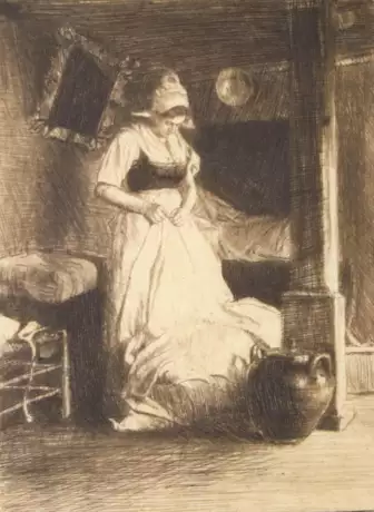 Weixlgärtner 56 3 (v. 4) mit Baum, Windmühle u. spiegelndem Wasser. W. 143 III (v. III) alles unter Ton gesetzt, so dass das ganze Licht auf der Wäsche... u. dem Federbett... vereint ist. - Beide Bl. unten mit Bleistift bezeichnet.