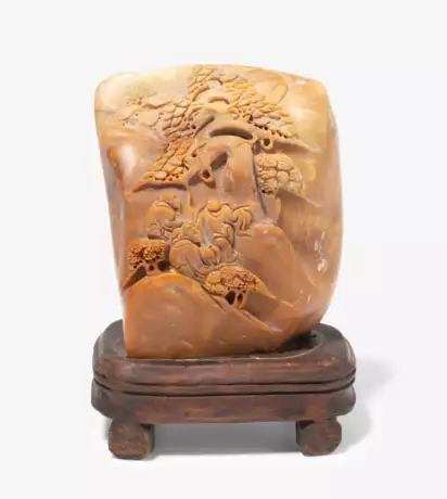 China, 20.Jh. Shoushanshi (Pagodite). Reliefierte figürliche Szene. H 13 cm. Ca. 924 g. Mit Holzsockel.