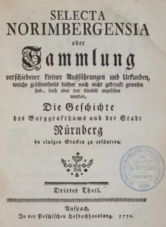 So kompl. selten. - Enthält viele interessante Beiträge zur fränkischen Regionalgeschichte, darunter Von Nürnberger Zollproceßen; Vom Pantoffel-Wein; Von den Heuschrecken; Schloß Schönberg und seine Jagden; Juden zu Fürth; Befestigung der Stadt Nürnberg; etc. - Bibl.-Ex. mit zahlr. Stempeln, etw. gebräunt.
