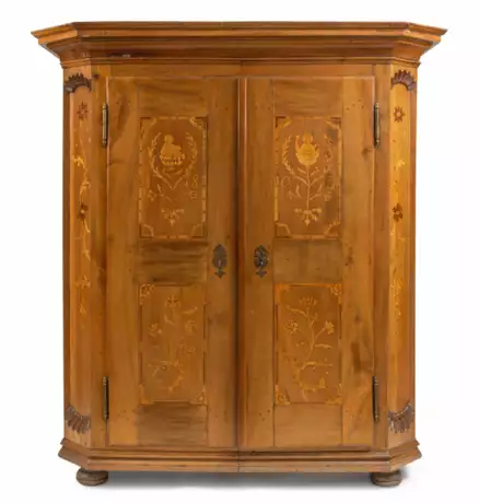 Zentralschweiz, datiert 1802. Nussbaumholz massiv. Zweitüriger, rechteckiger Korpus auf gedrückten Kugelfüssen mit profiliertem Gesims. Abgeschrägte Ecken ornamental beschnitzt. Die Türen mit figürlichen und floralen Darstellungen reich intarsiert. Innen Eisenschloss mit ornamental gravierter Messingplatte. Tablare. Zweiteilig. 166,5 x 70, Höhe 185 cm.