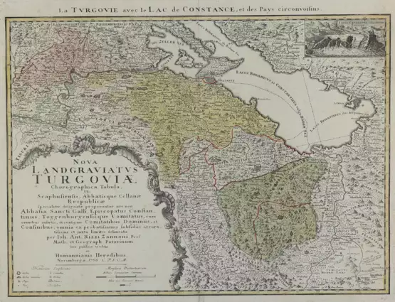 ╔Dabei:╗ La Turgovie avec le Lac de Constance./Thurgau und Bodensee. Alt-. teil- u. grenzkolor. Kupferstichkarte v. J.A.Rizzi bei Homann Erben, 1766. Blgr. 46,5 x 58,56 cm. Auf Karton aufgezogen. - Bugfalte sichtbar, leicht fl.