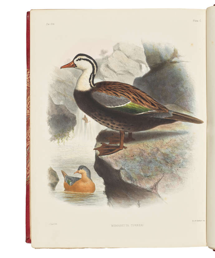 First and only edition of this important work on American avifauna: ‘a monument of erudition, industry and artistic excellence’ (Coues). This outstanding work depicts 104 species of Central and South American birds belonging to fifty-one different genera. The plates are the first executed by Smit after moving, at the instigation of Sclater, from Holland to England, and they are among the finest he ever produced. The preface states that the original intention of the work was to continue the series of illustrations contained in the ‘Planches Enluminées’ of Buffon and Daubenton, the ‘Planches Coloriées’ of Temminck, and the ‘Iconographie Ornithologique’ of Des Murs, but decided to concentrate on the birds in the Neotropical Region of America, i.e. south of the United States of America: ‘No other part of the world can vie with Tropical America in the richness of its Avifauna’ (preface, p.iii). Anker 450 (‘beautiful plates’); Coues 2:286; Fine Bird Books (1990) p.139; Nissen IVB 844; Wood, p. 558; Zimmer, p. 560.
