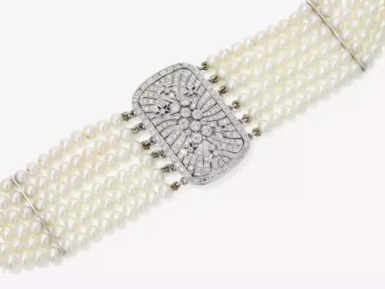 White gold 585/-. Approx. 14 diamond baguettes, approx. 130 small brilliant-cut diamonds, and approx. 12 brilliant-cut diamonds, all diamonds: good quality. 6 strands of white round cultured pearls. This piece of jewellery is in very good condition, showing only minor signs of wear and tear consistent with its age. Length approx. 35.5 cm. Ca. 73.3 g.