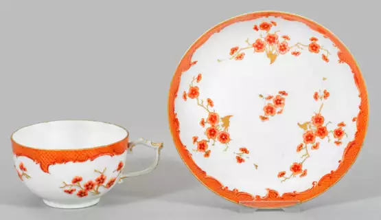 mit Untertasse. Halbkugelig gewölbter Korpus mit geschweiftem Ohrhenkel. Auf der Wandung und im Spiegel feiner Dekor, teilw. im Relief, aus Prunuszweigen umgeben von rocaillegerahmten, goldenen und eisenroten Schuppenmosaikbordüren. Korrespondierende Gestaltung auf der Außenwandung der Untertasse. Eisenrote Camaieumalerei mit Goldstaffage. Press-Nr. 52 und 53. Ascheflug. Minim. rest.; Schwertermarke. Tassen-H. 4,8 cm. Untertassen-D. 13,5 cm.
