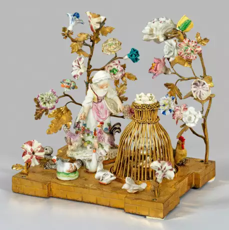 Auf flachem, rechteckig vergoldetem Bronzesockel mit durchbrochen gearbeiteter Vogelvoliere, stehende Hühnermagd beim Füttern von Gänsen und Hühnern. Auf dem Sockel eine Schar sitzender Vögel verschiedener Materialien und Manufakturen. Rücks. und zuvorderst aufsteigende Blütenzweige mit farbig staffierten, sog. Vincennes-Blüten. Polychrome Malerei mit Goldstaffage. Entw. der Magd Johann Joachim Kaendler, 1761. Partiell minim. best./rest. H. 22 cm. B. 22 cm.