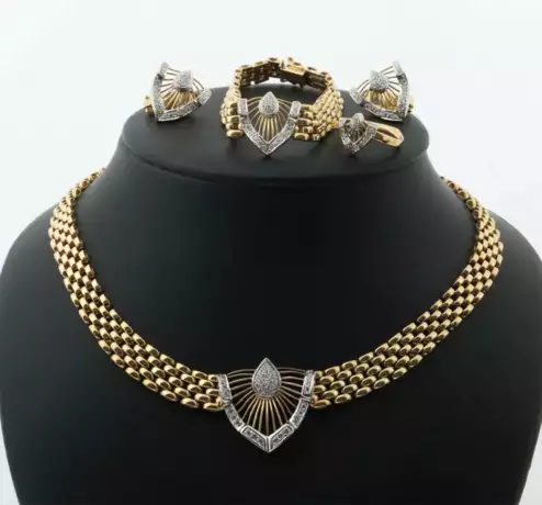 Лот 1444 | Set Goldschmuck Modern, bestehend aus Collier, Armband, Ring, Ohrsteck…
