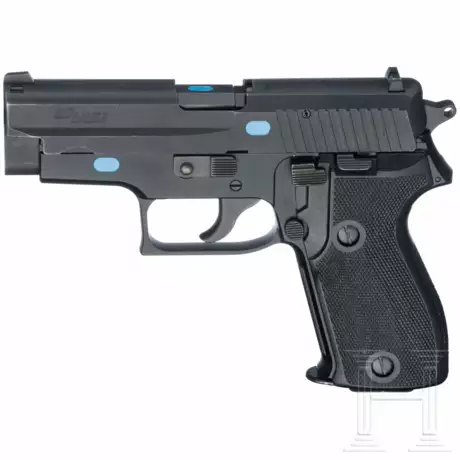 Kal. 9mmLuger, Nr. R003255, nummerngleich. Spiegelblanker Lauf, Länge 90 mm. Achtschüssig. Links am Verschluss "SIG Sauer", rechts Modellangabe "P 225 - PT". Beidseitig blaue Markierungen, jeweils einmal am Verschluss und am Rahmen sowie eine oben am Patronenlager. Originale Brünierung am Verschluss mit geringen Gebrauchsspuren. Das Duralgriffstück schwarz eloxiert. Schwarze Kunststoffgriffschalen mit Fischhaut, das vordere Griffband gerillt. Das Magazin mit Schiene für div. Aufsätze. Bei der hier vorliegenden Waffe handelt es sich um eine spezielle Anfertigung für die deutsche Polizei zum Verschießen von Plastik-Trainingsmunition. Sehr seltenes Sammlerstück!