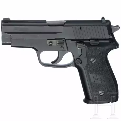 Cal. 9mmLuger, SN. B113322, nummerngleich. Spiegelblanker Lauf, Länge 97 mm. Dreizehnschüssig. Dt. Beschuss 1990. Eingeschlaufte Kimme und Korn. Links am Verschluss "SIG Sauer", rechts die Modellangabe. Originale Brünierung am Verschluss, das Duralgriffstück schwarz eloxiert, geringe Gebrauchsspuren. Schwarze, punzierte Kunststoffgriffschalen. Magazin. Bedienungsanleitung.