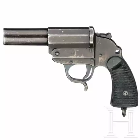 Cal. 4 (Signal), SN. 2361b, nummerngleich. Fast blanker Lauf. Beschuss. Ohne Ladeanzeiger. Breiter Hahn. Links am Rahmen Firmierung ,,ac / 41". Div. Abnahmen Adler/"359". Fertigung in schwarz eloxiertem Dural, leichte Tragespuren an den Kanten. Klein- und Bedienteile brünierter Stahl. Fehlerlose schwarze Kunststoffgriffschalen. Fangring. Eingesteckt in originale, schwarze Ledertasche mit aussenliegendem Putzstock. Nähte in Ordnung.