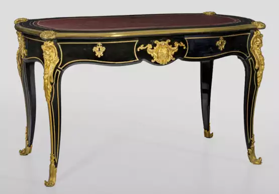 Flächendeckender Fond aus Schwarzlack sowie Einlagen aus Messing und reiche Applikationen aus vergoldeter Bronze. Passig geschweifter Zargenkasten, flankiert von Maskarons auf geschwungenen Beinen. In der gegliederten Front zwei Schubfächer. Gering überstehende, profilgerahmte Deckplatte mit eingelegter Arbeitsfläche aus bordeauxrotem, goldgeprägtem Leder. Mehrfach Schlagstempel-Sign. GROS PARIS. H. 77 cm. 130,5 cm x 77,5 cm.