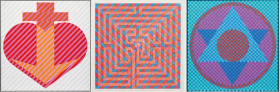 Leuchtende Op-Art-Kompositionen der Künstlerin Sine Hansen, die 1961-1966 an der Hochschule für Bildende Künste in Braunschweig bei Peter Voigt, Johann Georg Geyger und als Meisterschülerin bei Roland Dörfler studierte. In den 1960er Jahren hielt sie sich zu Studienzwecken auf Schloss Wolfsburg sowie in Amsterdam und Paris auf. Später lebte sie mit ihrem Ehemann, dem Maler Jobst Meyer, in Braunschweig."Kreisstern I": Öl/Lwd.; verso zweifach betitelt, dat. 1999 und sign. sowie mit rotem Inkastempel. Ca. 50 cm × 50 cm. Rahmen. "Liebe, Glaube, Hoffnung": In Rot- und Grautönen gemalte Op-Art-Komposition mit den Symbolen Kreuz, Anker und Herz. Öl/Lwd.; verso zweifach betitelt, dat. 1994 und sign. sowie mit Widmung. Ca. 51 cm × 51 cm. Rahmen. "Labyrinth": Buntstift/leichter Karton; sign., betitelt, dat. 30.3.(19)95 sowie mit Widmung. Darstellung 31 cm × 31 cm. Blatt 34 cm × 34 cm. Rahmen.