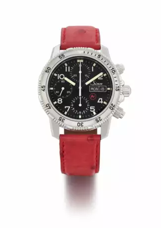 Description: 3-hand-chronograph with date and weekday display at '3' o'clock, 12-hour counter at '6' o'clock, off-centre seconds at '9' o'clock and 30-minute display at '12' o'clock.