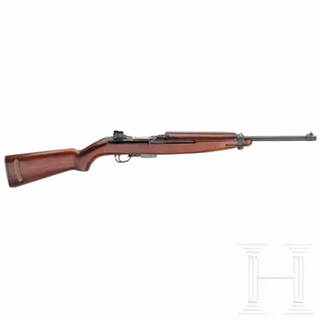 Kal. .30Carbine, Nr. 6678915, blanker Lauf. Alte KWKG-Änderung ohne Kornschutzbacken. Fünfschüssiges Magazin. Dt. Beschuss. Dioptervisier. Hergestellt bei GM, Inland Division. Vollständige, originale Phosphatierung. Dunkler Nussholzschaft, Ölerfach verschlossen. Gute Erhaltung.