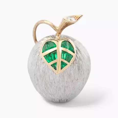 Binder, Zürich, 1970er Jahre. 750 Weiss-/Gelbgold. Weissgoldener, strukturierter Anhänger in Form eines Apfels mit gelbgoldenem Stiel und Blatt. Das Blatt mit zehn Smaragden von diverser Schliffart, am Stielende ein Brillant von ca. 0.10 ct. L 2,6 cm, 12 g.