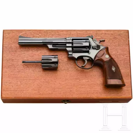 Kal. .22RemJetMag, Nr. K474123, blanker Lauf, Länge 6". Sechsschüssig. Dt. Beschuss 1966. Links am Lauf signiert "Smith & Wesson", rechts "22 Magnum". Mikrovisier. Vollständige, originale Hochglanzbrünierung. Hahn und Abzug buntgehärtet. Magna-Style-Nussholzgriffschalen. In Holzkassette mit Wechseltrommel .22 lr. Nahezu neue Erhaltung. Gesamtfertigung nur 15.000 Stück.