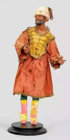 Neapolitan figure of an oriental soldier. Painted terracotta, several other materials, fabric. Wooden base later. Minor damaged/signs of age and use.