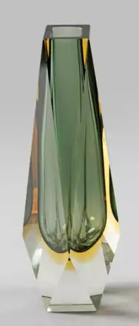 Dickwandiges, farbloses Kristallglas mit grünem und gelbem Unterfang. Entw. Flavio Poli, 1970-1979. H. 30,5 cm.