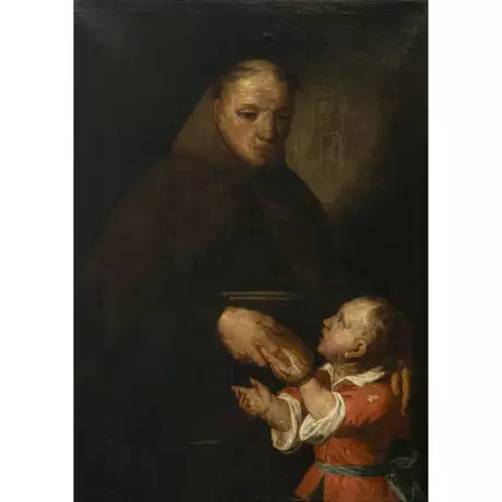 Old catalogue excerpt with attribution to "Murillo" (Bartolomé Esteban Murillo, 1617 Sevilla - 1682 ibid.) and titled "Der hl. Vincent de Paula" on the stretcher verso. Oil on canvas. 108.5 x 82 cm. Relined. Restored. Minor damage. Damage to frame (131 x 100.5 cm).