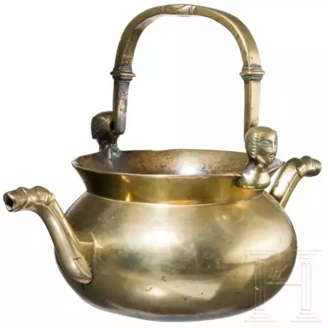Bauchiger Kessel aus Messing mit zwei seitlich angesetzten Ausgüssen mit Hundekopfmotiven. Die ausgestellte Lippe mit zwei Ösen in Form von Frauenbüsten. Originaler beweglicher Messinghenkel. Guter, kaum verputzer Zustand, minimal verbeult. Höhe ohne Henkel 17 cm, Breite 35,5 cm.