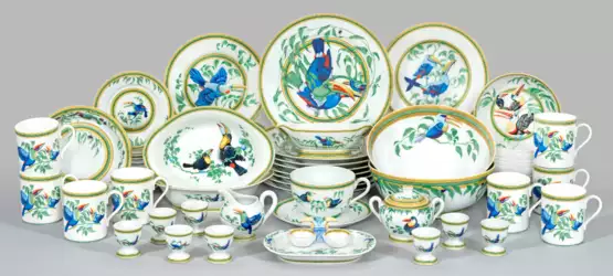 für 8 Personen. 68-tlg.; 8 Suppentassen, 8 Dessertteller, 8 Speiseteller, 8 Kaffeebecher, Zuckerdose, Sahnegießer, 2 ovale Anbietschalen, 8 Schälchen, 2 große Rundschalen, 8 Eierbecher, große Frühstückstasse mit Untertasse, 10 Brotteller, Menage, Rundschälchen, Sauciere mit Unterschale. Farbenprächtiger Dekor mit Tukanen. Bez. "HERMÈS". Ein Speiseteller minim. best.; Firmen- und Manufakturmarke. Speiseteller-D. 27 cm. Kaffeebecher-H. 9,5 cm. Rundschalen-D. 25 cm.