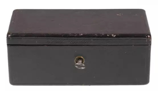 Лот 678 | Spielkarten-Box, J. Weidman K.K. Hoffabrikant Wien, Holz mit Lederbezug, Scharnier-Deckel und -Front aufklappbar, im Inneren 4 Fächer mit Messingmontur, Hakenschloß mit Schlüssel. 7,5x18,5x9 cm, dazu kleines Patience-Kar…