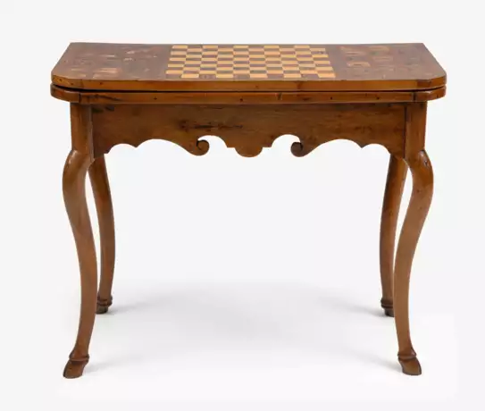 2. Hälfte 18.Jh. Nussbaum und verschiedene Hölzer. Rechteckige, passig ausgeschnittene Zarge auf geschweiften Beinen mit Huffüssen. Parkettierte und mit Schachbrett eingelegte Platte. Ausziehbar, die aufklappbare Platte mit grünem Filz bezogen. 83 x 40, Höhe 70 cm, aufgeklappt 83 x 80, Höhe 66,5 cm.