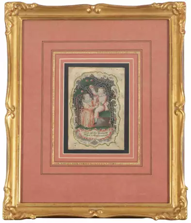 Süddeutsch, 18.Jh. Pergament geschnitten, gestichelt und genadelt, partiell gouachiert. In Rokoko-Kartusche unter Apfelbaum sitzendes Liebespaar. Schriftkartusche: "Was ich dir Presentir / nihm willig an von mir". Umgeben von feinem Ästchen- und Netzmaschenschnitt mit Blumen und Rocaillen. 10,5x6,5 cm (Schnitt). Rahmen ergänzt. 30,5x25,5 cm.