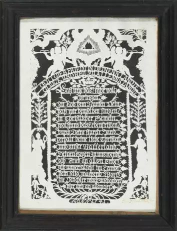 Deutsch, signiert Joh. Joseph Wild, datiert 1741. Pergament geschnitten und gestichelt. Schriftfeld bekrönt von Auge Gottes und Putti, flankiert von den allegorischen Figuren "Friede" (links) und "Glaube". Übertitelung: "GOTT GIEB FRIEDT IN DEINENN LANDTE / GLUICK UND HEIL ZU ALLENN STANDTE". 15-zeiliger Neujahrswunsch mit Datierung "AONN 1741". 18,5x13,5 cm. Auf schwarzem Papier in ebonisiertem Holzrahmen. 22,5x17 cm.
