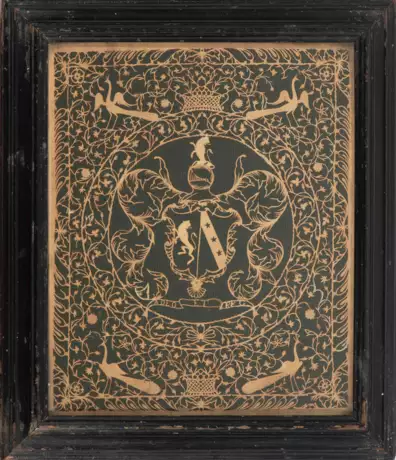 England, 18.Jh. Vergépapier geschnitten und genadelt. In rundem Medaillon behelmtes Wappen mit lateinischer Devise "A DEO ET REG(E)" (Von Gott und König). Umgeben von feinem Spiralrankenschnitt, in den Zwickeln Pfauen. 21x17 cm (Schnitt). In ebonisiertem Originalrahmen. 25,5x22 cm.