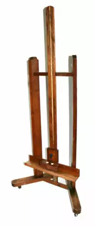 Höhenverstellbare Staffelei aus Holz mit Rollen. Für große Formate geeignet. Maße: H. 275, B. 80, T. 60 cm. (A53)