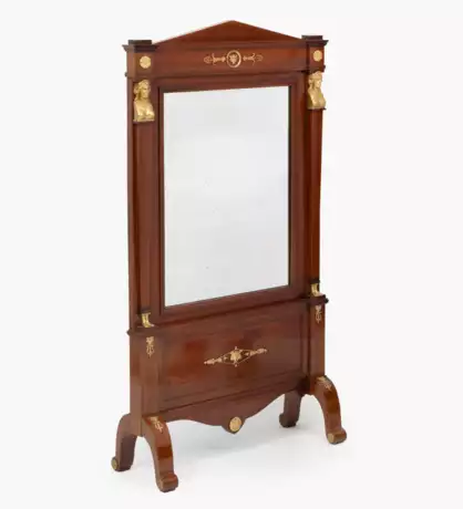 Zweite Hälfte 19.Jh., Empirestil. Mahagoniholz. Rechteckiger, profilierter Rahmen auf Sockel mit Kufenfüssen. Seitliche Pilaster und Giebelabschluss. Vergoldete Bronzebeschläge. Altes Spiegelglas. Höhe 137 x 30 cm.