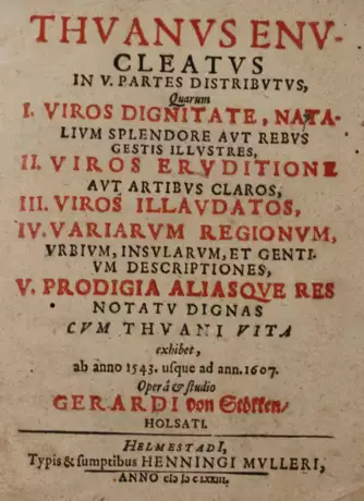 Jöcher IV, 851. - Seltene Kompilation des berühmten Geschichtswerkes von Du Thou mit dessen Biographie. - Tls. wurmstichig (tls. Buchstabenverlust). - Provenienz: Adelsbibliothek.