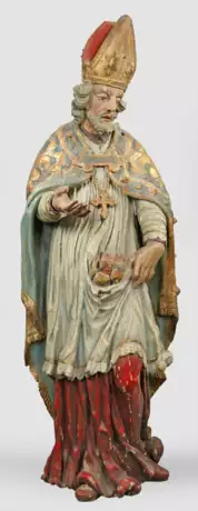 Lindenholz, vollplastisch geschnitzt und farbig gefasst. Rundumsichtig komponierte, nahezu lebensgroße, künstlerisch qualitätvolle Ganzfigur wohl des Erzmärtyrers Hl. Stephanus im Bischofsornat, in beredter Bewegung und Gestik agierend. Als kennzeichnendes Attribut Steine in seiner Schoßfalte darbietend, in der rechten Hand fehlt wohl der Märtyrer Palmzweig. Teilw. polychrome Fassung verloren, rest.; H. 151 cm.