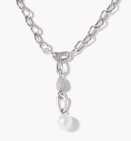 750 Weissgold. Modern gestaltete Ankerkette mit einem abnehmbaren Pententif mit einer weissen Südsee-Kulturperle, 14x13 mm, und einer pavégefassten Tropfen. L 41, 81 g.