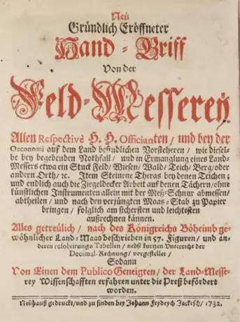 VD18 11015497. Sehr selten. - Für die Praxis angelegt, enthält auch eine Anleitung wie die "Ziegeldecker-Arbeit auf denen Tächern,... mit der Meß-Schnur abmessen, abtheilen, und... zu Papier bringen" ist. - Leicht gebräunt u. tls. etw. fleckig, einige Bll. mit Wurmgang, letzte 2 Bll. mit kl. Eckabriss, Ebd. berieben.