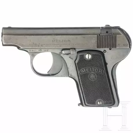 Kal. 6,35mmBrowning, Nr. 93358, nummerngleich. Viel geschossener, aber brauchbarer Lauf. Sechsschüssiges Magazin. Belgische Beschuss- und Kontrollmarken. Kurze Sicherung. Handballensicherung, Magazinsicherung. Signalstift. Links am Verschluss Modell, Herkunftsort und Herkunftsland sowie Patente. Vollständige Brünierung, partiell gering fleckig und stellenweise leicht angerostet. Schwarze Hartgummigriffschalen mit feiner Fischhaut und Modell-Logo. Große Ausführung. Brauchbare Erhaltung.