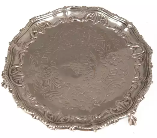 Лот 723 | Tablett auf 3 Füßen, versilbert, rund, reliefiert, H. 3 cm, Dm. 20,5 cm