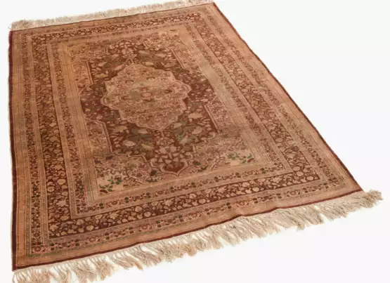 NW-Persien, um 1900. Flormaterial und Kette reine Seide. Im terrakottaroten Mittelfeld thront ein kunstvoll gefertigtes weisses Medaillon mit 2 Anhängern, flankiert von einem üppigen floralen Dekor in Pastellfarben und 4 weissen Eckzwickeln. 2 Blütenranken-Nebenbordüren sowie mehrere Borten umgeben die breite rote Blattranken-Bordüre auf dekorative Weise, die einen aparten Rahmen bildet. Stark brüchig, Risse, ansonsten gute Erhaltung. 127x171 cm (ft. 4.2x5.6).