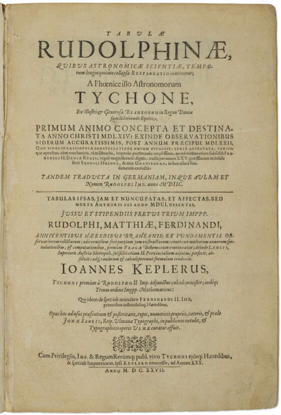 This work is bibliographically complex. One thousand copies were printed in Ulm in 1627. There are three states of this printing, affecting only the title-page and the first two gatherings, and largely explained by the publishing history of the book. The title exists in three states; the above is in the third state. The first gathering (dedication to Ferdinand II by Brahe’s heirs and Kepler) is in the third state, and the second gathering (dedicatory poem by Johann Baptiste Hebenstreit) is also in the third state. Brahe had entrusted Kepler to complete his planetary tables, but over the 26 years that it took Kepler to perform this task, the work became his own. Nonetheless, he included a dedication by Brahe’s heirs to the Emperor, as well as one of his own of much greater length. The heirs took exception to this, and so Kepler modified the dedication. Kepler moved from Ulm to Sagan in 1628, and published in Sagan in 1629 the Sportula. The present copy includes the Sportula, which consists of directions for using the tables for astrological purposes.