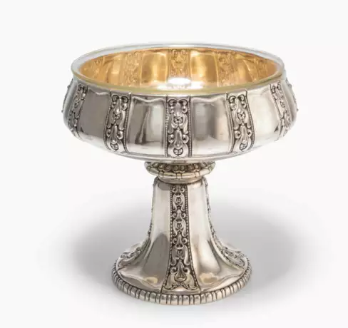 Silber, innen vergoldet. Gemarkt Schaerer. Weite Rundform mit konvexer Wandung über hohem Fuss. Mit vertikalen Blattreliefs. Glaseinlage. Feingehalt 800. D 25 cm, H 25 cm, ca. 920 g.