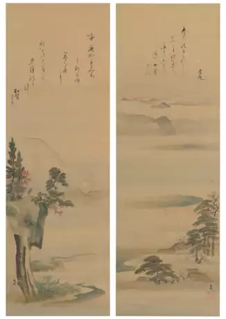 Each signed Buncho and sealed Buncho ga in; right scroll inscribed by Kimura Kibun (1778-1850) and left scroll inscribed by Yashiro Hirokata (1758-1841)