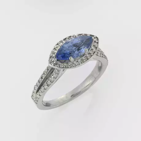 Weißgold, gest. 14 ct.; Zentral besetzt mit blauviolettem Tansanit von ca. 1,30 ct., entouriert von kleinen Diamanten von zus. ca. 0,60 ct.; Gew. ca. 4,02 g.